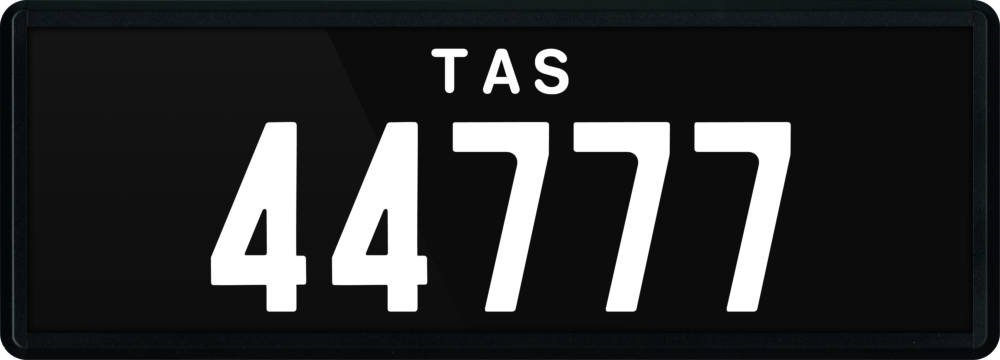 A bold plate combining steady 4s with lucky triple 7s. Easy to remember and full of positive energy. The plate is made from acrylic clear polymer and is set into a black anodised aluminium frame. It features white characters on a black background, with the state identifier positioned on the top of the plate.