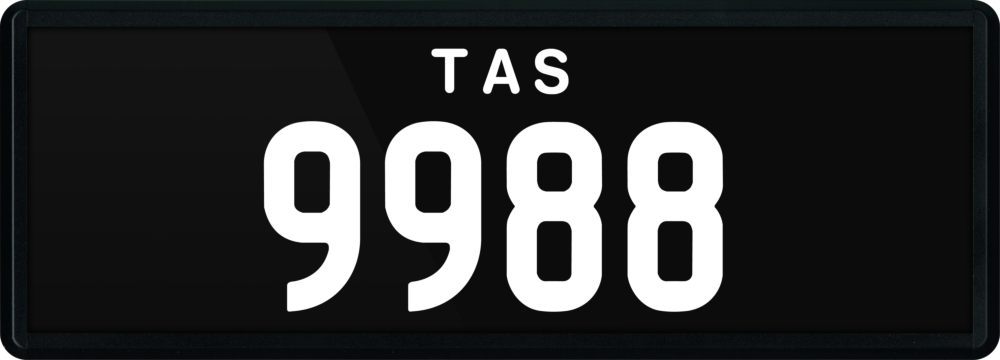 A powerful plate combining 9s and 8s, symbolizing achievement and wealth. Perfect for a confident, memorable number plate. The plate is made from acrylic clear polymer and is set into a black anodised aluminium frame. It features white characters on a black background, with the state identifier positioned on the top of the plate.